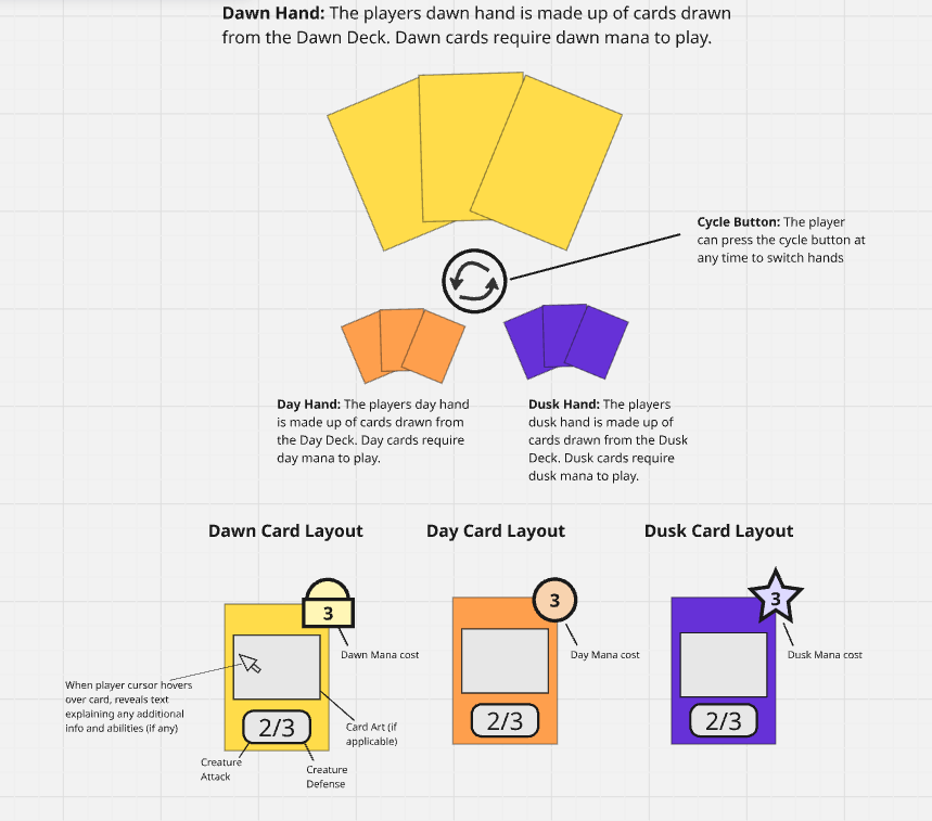 Very interesting game concept! I enjoyed the similarities that it shares with Magic The Gathering and Hearthstone. I think something that could be improved upon is that the mana ages as the player doesn’t use it, and also that dusk mana could stay as dusk within the game.