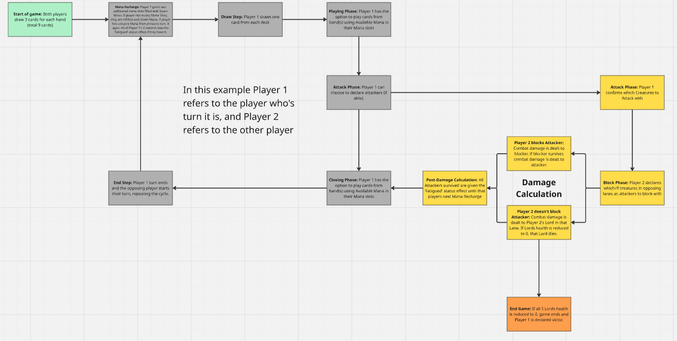 Damage Calculation: Attackers deal damage to blocked creatures first, if blocked creature/s survive, they then deal damage to the attacker. If no blockers were declared the attacking creature deals damage to the opposing Lord in their lane. All attackers survived gain the 'Fatigued' status effect (cannot be used to block on opposing players turn).